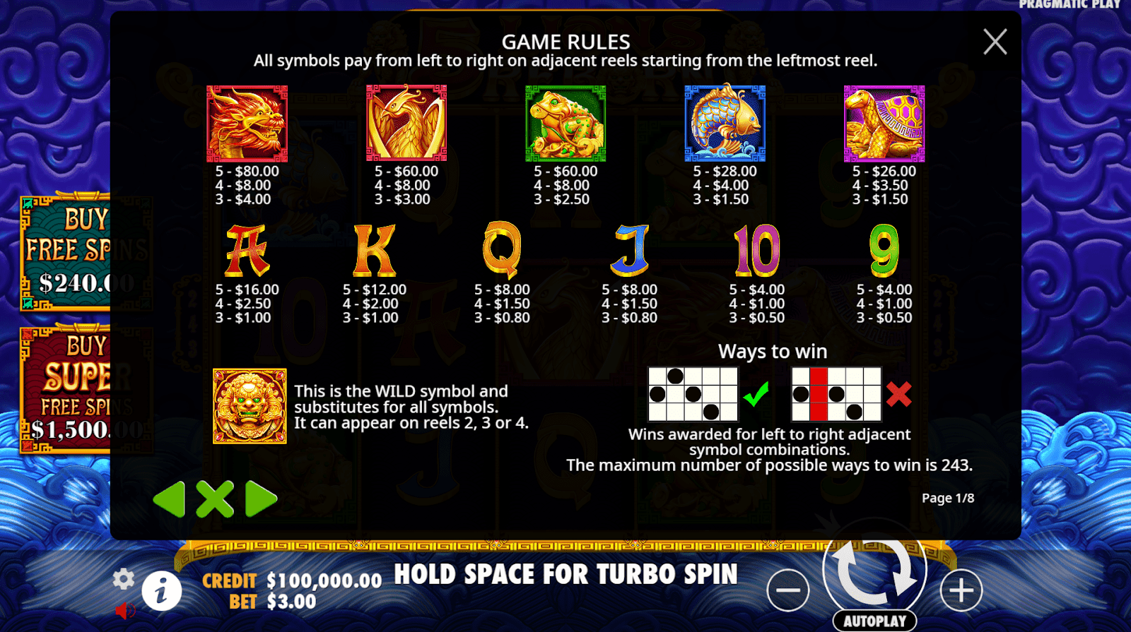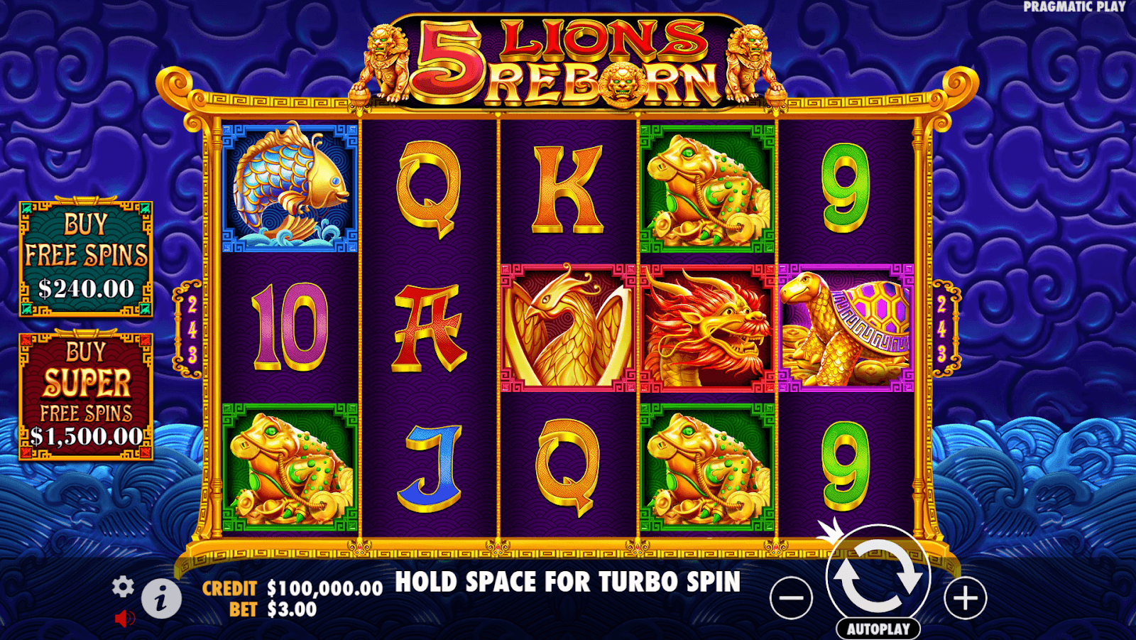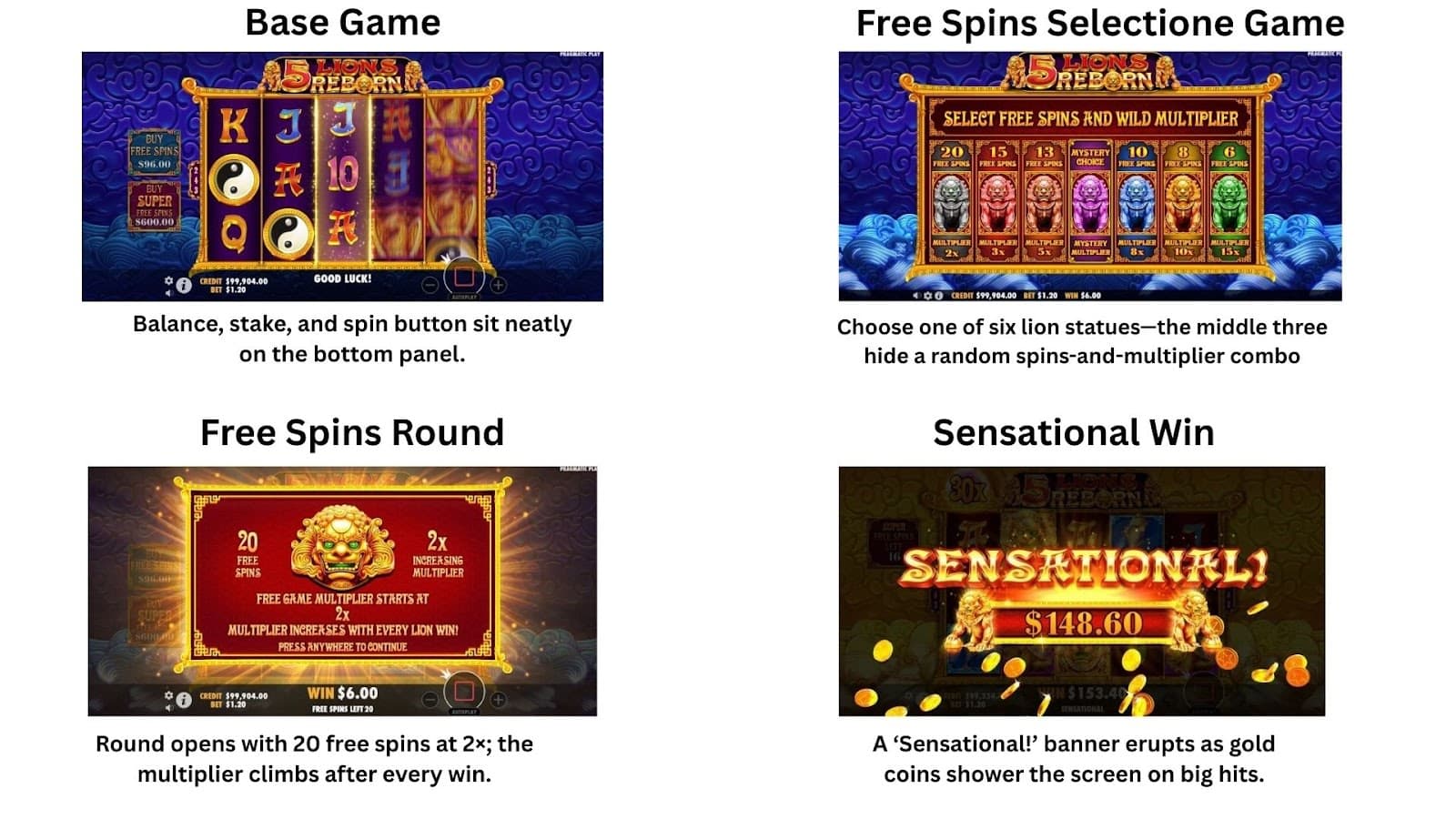 5 Lions Reborn은 불사조, 거북이, 잉어 상징이 화려한 금색 세공 모양으로 반짝이는 옥빛 사원을 배경으로 풍부하고 섬세한 그래픽이 특징입니다.미묘한 파티클 플레어와 라이트 버스트는 전통적인 중국 미학을 과장하지 않으면서도 세련되고 역동적인 느낌을 더합니다.